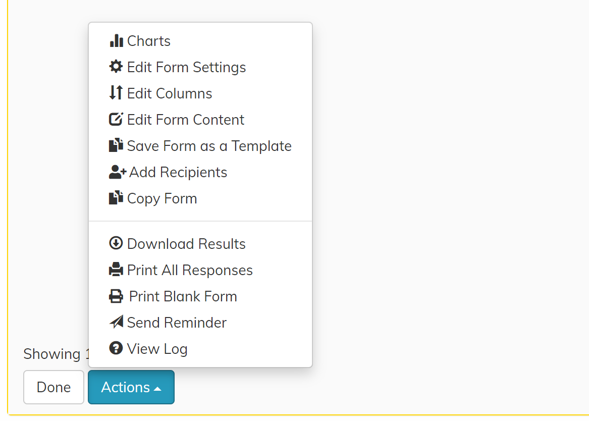 The actions menu at the bottom of the page allows you to perform various functions on the form: